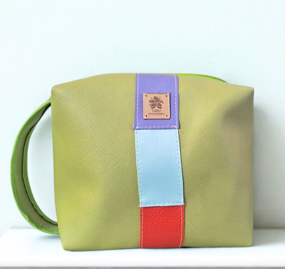 Necessaire em sintético, verde claro com costura criativa e forro impermeável, medindo: comprimento 20cm, largura 20cm, fundo 9cm, lateral 9cm