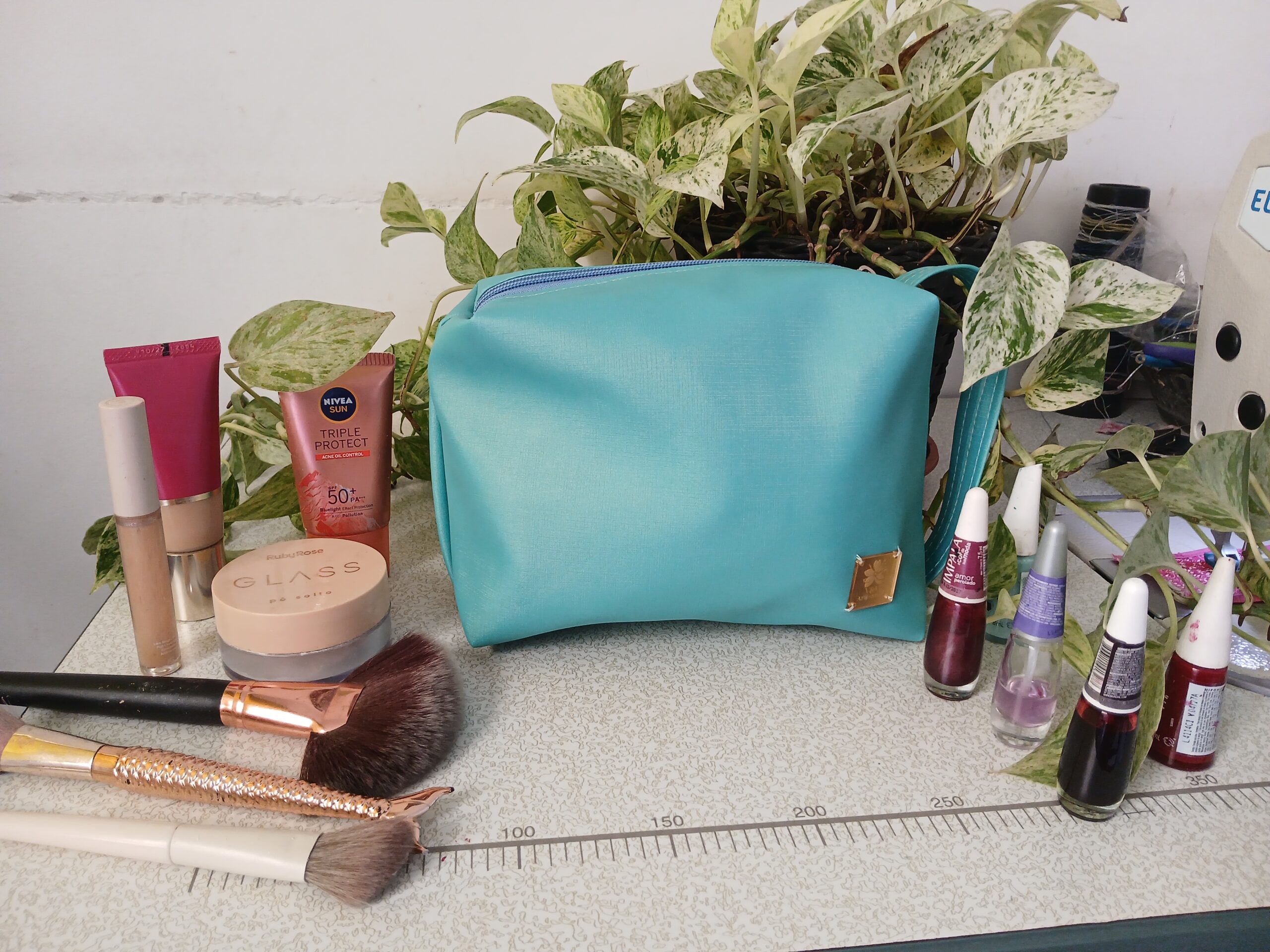 Necessaire em sintético na verde claro liso e forro impermeável, medindo: comprimento 20cm, largura 20cm, fundo 9cm, lateral 9cm