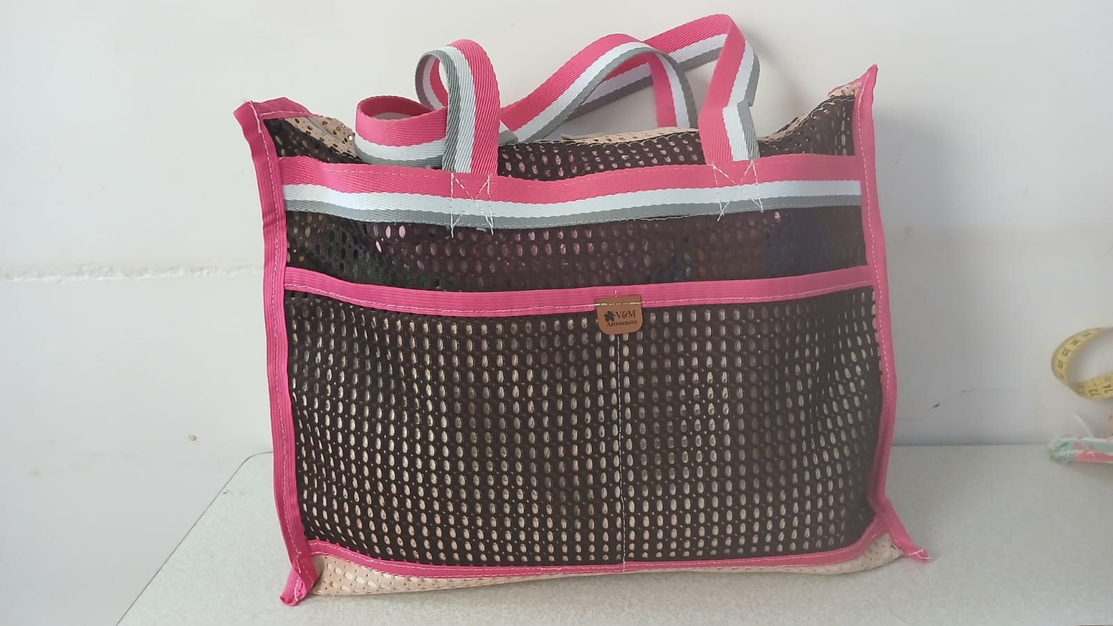 Sacola para Praia e Piscina com costura criativa nas cores Bege com café os detalhes em rosa